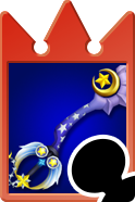 The guard appears to be two shooting stars. The blade is blue and decorated with stars and curves near the tip on one side with a golden crescent moon and star on the other side. In Kingdom Hearts Birth by Sleep, Mickey wields it such that the curve acts as the teeth, while in all other instances, the star and crescent moon serve as the teeth. The Keychain design is a crescent moon. The Keyblade's name seemingly references Mickey and Sora's journeys to the various worlds, which are seen as stars.
