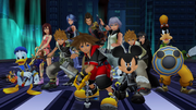 Xion is the Rank XIV member of the original Organization XIII, and appears in Kingdom Hearts 358/2 Days as one of the main protagonists and antagonists. She is not a normal Nobody, and is only a nominal member of the Organization. Because of this, she does not have a throne in Where Nothing Gathers, nor does she have a title or a breed of Nobody to control. Instead, she is an imperfect Replica of Roxas created from Sora's leaked memories as a fail-safe in case both Sora and Roxas proved to be useless to Organization XIII's plans. While this enables her to use the Keyblade, Xion's existence also halts Sora's progression of regaining his memories to fully awaken while in his pod, something which Naminé, DiZ, and Riku recognize. As Sora's memories are the basis of her being, Xion initially resembles Kairi, who was Sora's strongest memory at the time of her birth, though her physical appearance eventually changes depending on who is viewing her and who they have connections with. Roxas, Axel, and Riku see her as Xion (and later as Sora), Xigbar sees her as Ventus, Xemnas sees her as Sora, while Saïx (and also Axel, initially) sees her only as a hooded doll. As Naminé stated while talking with Riku, Xion's face was originally blank, until Sora's memories found their way into Xion and she gained an identity. Xion's name was coined by Tomoco Kanemaki, one of Kingdom Hearts 358/2 Days's scenario writers and the writer of the Kingdom Hearts novels. Tetsuya Nomura took a liking to it and notes that it has many meanings. Xion's name contains the Japanese words for "tide" (潮 shio), fitting the oceanic naming theme of Kairi and Naminé, and Aster tataricus (紫苑 shion), which, according to Japanese floriography, means "I won't forget you" or "remembrance". It is also revealed within the Secret Reports that her "original name" was "No.i", her ID as an experiment of the Replica Program. The "i" used here is in fact the imaginary number. Xion was voted "Best New Character" in the 2009 Nintendo Power Awards. ContentsStory[edit]Kingdom Hearts 358/2 Days[edit]A week after Roxas joins Organization XIII, Xemnas introduces Xion to the other members. After looking at the other members, she smiles up at Roxas, puzzling him. As Roxas departs for his first training mission, he spots Xion shyly watching him nearby, and Saïx formally introduces her to Axel and Roxas. When Axel is sent to Castle Oblivion, Xemnas entrusts Roxas with the task of looking after Xion, who quickly bonds with him. After only a couple missions together, Xion removes her hood, surprising Roxas by her gender. She reveals her ability to wield the Keyblade to him, and looks after him when he falls into a coma for several weeks in conjunction to Sora being put to sleep to regain his memories. After discovering that Sora and Riku had slain all of the Organization members (except Axel) that were in Castle Oblivion at the time, Roxas, Axel, and Xion all begin spending more time together as per Roxas's suggestion and become fast friends, such as enjoying sea-salt ice cream together. After Xion asks Axel to be her friend, and he accepts, he stops seeing her as a hooded figure, and begins seeing her as the black-haired girl that Roxas sees. However, a series of events begin to split the trio apart: While DiZ and Naminé oversee the restoration of the sleeping Sora's memories (moving him from Castle Oblivion to Twilight Town), Roxas begins to experience the process for himself, and begins to ponder over how he is able to wield the Keyblade and doubt the Organization's motives; Axel is reprimanded by their superiors for placing his friendship with Roxas and Xion before the Organization's goals; and Xion is thrown into disarray after a confrontation with Riku, who questions who she is and why she wields the Keyblade; he later finds her unconscious on Destiny Islands, and explains to her that his friend Sora needs Xion to return him his memories if he is to ever awaken. She doesn't understand why she has Sora's memories to begin with, causing her to become torn between staying with her friends in the Organization, or leaving to merge with Sora as Riku suggests. Xion travels with Riku for several days before being captured by Axel and brought back into the Organization. However Naminé's attempts to restore Sora's memories are soon halted when Xion starts absorbing them faster, causing Roxas to weaken while she becomes stronger, as Xemnas intended. Eventually, after being tricked into fighting Roxas by Saïx, Xion decides to take Riku's advice and leaves the Organization. After her departure, Xion comes into contact with Naminé in Twilight Town's Old Mansion, questioning her own existence and the fate that will soon befall Roxas. She discovers that she is not a Nobody, but an imperfect Replica of Roxas. Naminé also reveals that as a memory being, once Xion returns to Sora, everyone's memories of her will inevitably be forgotten. Furthermore, Naminé's attempts to restore Sora's memories not only affect Roxas, but Xion as well, stating why they both keep having memory relapses throughout the game. Xion accepts the facts, and decides to go back to Sora. Before she does, though, DiZ barges in with the news that an Organization member has followed her, in which Xion says she will take care of it, despite Naminé's protests, and heads out of the mansion. It is Axel who has arrived, having finally tracked Xion down. Not only is Axel curious of Xion's motives, he is also given specific orders to capture her again, which would possibly convince Roxas to return to the Organization. Xion refuses, leaving Axel no choice but to accomplish his mission with full force, leading to a heated battle. Having defeated Xion, Axel brings her back to The World That Never Was, but soon faints from fatigue. Xemnas then steps out from the shadows and carries the unconscious Xion away to reprogram her to use the devices he had planted throughout the worlds. Soon afterward,