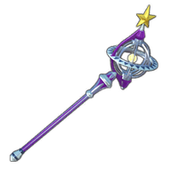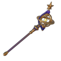 The Astrolabe has a gold and purple striped staff with a gold pommel. The other end of the staff is gold with purple triangles. The head consists of a gold spherical astrolabe held with a purple frame with a gold star on top, and a glowing yellow sphere in the center.