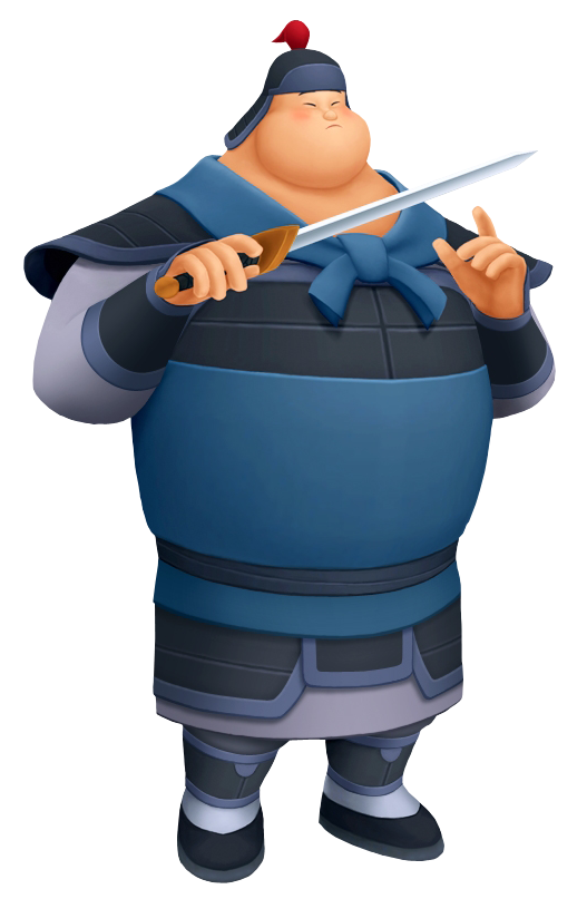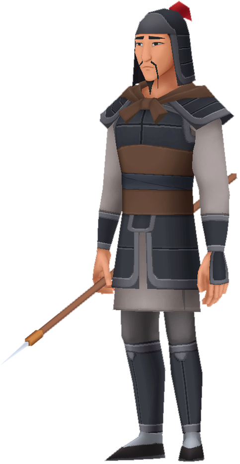 Sora, Donald, and Goofy encounter their old friend and Summon, Mushu, guarding and guiding a young soldier-to-be, Mulan, disguised as a boy named Ping. The group makes their way to a nearby army encampment, where they persuade the general, Li Shang, to allow them to join after some training. Unfortunately, Ping's attempts to prove himself cause problems for the army and Sora's party, and is unmasked as Mulan.