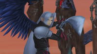 | A return trip to Hollow Bastion, and to Space Paranoids, finally allows Leon's group to truly begin work on restoring Hollow Bastion to what it truly was – the city of light, Radiant Garden. Later, Sora encounters Sephiroth, who wishes to test the Keyblade bearer's mettle, curious if it will choose him as its new wielder. Despite the master swordsman's formidable skill, Sora ekes out a victory, but Sephiroth shrugs it off and claims only Cloud can defeat him, requesting Sora bring him along. Once Cloud arrives, a fierce battle ensues. Tifa appears and tries to help, but the two fly off into the sky and continue their clash. Tifa departs, still determined to find Cloud. | ||