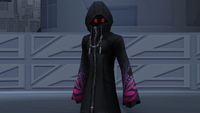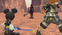 | On his journey, Sora encounters the mysterious hooded man once more. They engage in comat in the Land of Dragons. Curiously, the hooded figure wields the Soul Eater, the same weapon Riku uses. | ||