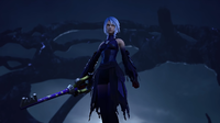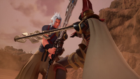| Sora assists Aqua and Ventus in fighting Terra-Xehanort and Vanitas. Sora and Ventus try to reason with Vanitas once he is defeated, but Vanitas is content with his role – darkness. Terra-Xehanort nearly kills Ventus and Aqua, but the Dark Figure saves them, betraying Terra-Xehanort. With Sora's help, Terra's heart is released from the Dark Figure, and Terra regains control of his body. | ||