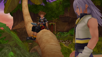 | Riku attempts to fend off Dark Riku, Xigbar, and Ansem. When Sora joins the battle, Ansem takes his leave, and the two Organization members are quickly dispatched. Bested once again, Xigbar laments that if he had a Keyblade, things would have been different. When Sora and Riku taunt that he would never be worthy to wield one, Xigbar cryptically proclaims he has always been worthy before ostensibly falling to his death. Upon Dark Riku's defeat, Riku Replica emerges from Riku's heart and forces his past self's heart out of its vessel; instead of inhabiting the Replica himself, he leaves it for Naminé, content with fading away forever. Sora leaves to another battle, after which Demyx arrives to take Dark Riku's Replica body back to Ienzo. Riku chases after Ansem. | ||