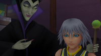 | Maleficent and Pete continue to antagonize Data-Sora and company, cutting of the link to the real world and trapping them all inside the Datascape. She abuses the nature of the data world to destroy Data-Sora's Keyblade and takes Data-Riku hostage. Data-Sora, with the help of Donald and Goofy, travels to Hollow Bastion to save his friend and the journal. | ||