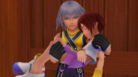 | Over the course of the same year, Kairi has been searching for clues to Sora's whereabouts as well. Following her sojourn into her own heart and experiencing the memories of Sora and those connected to him, Kairi finds herself facing a memory of Master Xehanort in The Final World. Following a fierce clash, he overpowers her, but a manifestation of Sora takes over her body and defeats him. However, Sora's voice is not capable of reaching either of them, cluing Xehanort to his location. He shares the clue with Kairi: Sora is in a world opposite of light, darkness, and reality itself. | ||