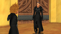 | Ansem, Seeker of Darkness has taken Ansem the Wise to the mansion in Twilight Town, planning to force the Sage-King to work for the Organization. Hayner's gang, with help from Vexen, are able to free Ansem from the Seeker's clutches and spirit him to safety. Vexen reveals that, with some help from Demyx, he was able to smuggle a Replica vessel to Ienzo for the purpose of resurrecting Roxas. He, too, wishes to atone. | ||