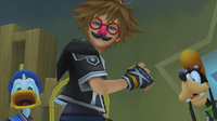 | The pint-and-a-half trio reunite with Leon's gang in Hollow Bastion. They have been working hard to rebuild the world back to Radiant Garden, and have officially invited Sora and his companions to be the Restoration Committee's honorary members. The celebration is short-lived however, as Xemnas and the rest of the survivors of the Organization confront the Keyblade bearer. | ||