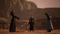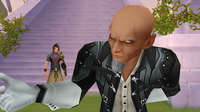| Meanwhile, at the Keyblade Graveyard, Master Xehanort recalls his fateful encounter with the Master of Masters, wondering if he will ever discover the man's true identity. He is accompanied by Xigbar and Saïx, and the three of them go over their current roster and weigh their options as to how to fill the ranks. Despite the failure of obtaining Sora, Xehanort reveals they still have two other potential vessels: the Riku Replica and Xion. | ||