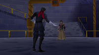 | Despite Riku's victory, he and Mickey are quickly subdued by Ansem and Xemnas. Goofy and Donald come to their rescue, but they too fail. Master Xehanort is fully revived, and with the No Name in hand, he prepares to claim Sora as his latest vessel. At the very last second, Lea swoops in and rescues Sora. To his shock, he discovers that Isa – or rather Saïx – is also now one of Xehanort's vessels. With Master Xehanort missing his window of opportunity, the rest of the vessels all begin to fade as they are returned to their original timelines. Xehanort, however, is unconcerned, confident that everything will fall into place eventually. | ||
