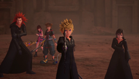 | Sora arrives to assist Kairi and Lea in fighting Xemnas, Saïx, and Xion. Xemnas orders Xion to kill Lea, but Saïx's taunts and Sora's pleas resonate with her; Xion's heart is released from Sora and returns to her body, forcing her old self's heart to return to its own time. Roxas arrives in his own Replica body, his heart also returning to its rightful place. Roxas, Xion, and Lea symbollically reclaim the Recusant's Sigil as a sign of their bond. In retaliation, Xemnas kidnaps a weakened Kairi and absconds from the battle. Sora, Roxas, and Xion defeat Saïx, who makes amends with Lea before fading away. | ||