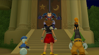 | Riku pays a visit to the Land of Departure, his promise to Terra fulfilled. Together, Terra, Aqua, and Ventus don their Keyblade Armor and head off into the Realm of Darkness to search for Sora. | ||