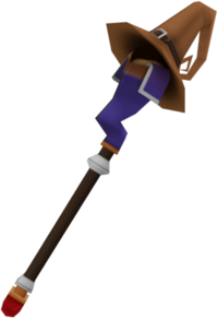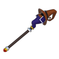 The Mage's Staff's handle is black with a red pommel connected to a dull yellow section and a white ring near the tip and base. The lower half of the staff's head is bent and blue and has a blue "collar" with white edges folded over it, resembling Donald's sailor suit. The upper half sports a brown hat with a long, curled tip and a black, silver-buckled belt around it, similar to the hat of a classic Final Fantasy Black Mage.