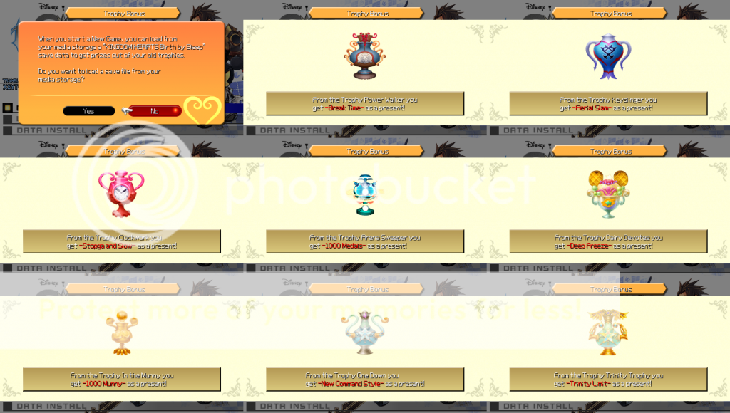 - Yeah, this probably needs more clarification. I still haven't completed a single story in the ReMIX at the moment (still in the middle of Terra's), so I don't know if these bonuses actually still exist here. They didn't really exist in the original Final Mix either, at least not (and that's the important part) if you didn't had a save file from the original Birth by Sleep. Because the savegames don't carry over these bonuses provide some sort of a head start for players who already completed the original Birth by Sleep with all trophies (also changing the sticker rewards in the process). In fact that's not the first time SE did something like that, some of the Final Fantasy International Versions feature something similar. --ShardofTruth 20:33, 25 January 2015 (UTC)